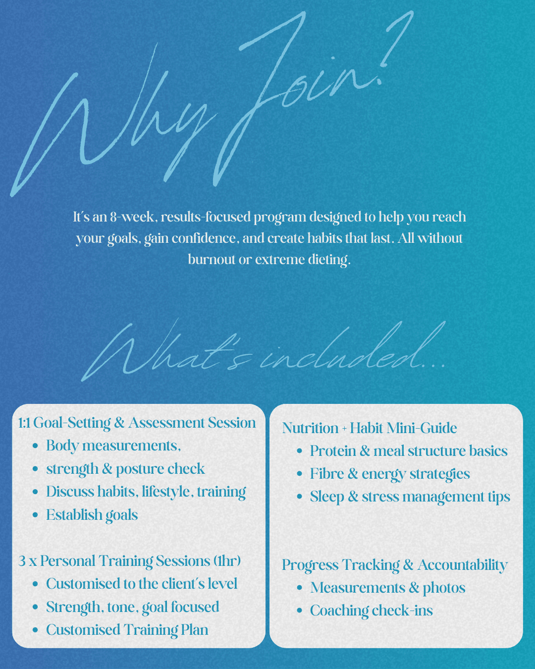This isn’t about quick fixes or chasing the scale. It’s about creating sustainable routines around training, nutrition, and lifestyle that actually fit real life and lead to lasting results.